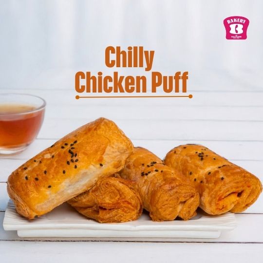 Flaky puff pastry loaded with spicy and tangy chilly chicken filling — Bakery B’s Chilly Chicken Puffs are a fiery twist on your favourite snack. Bold flavours, juicy chicken, and crispy layers come together in this 4-piece set that’s perfect for spice lovers.