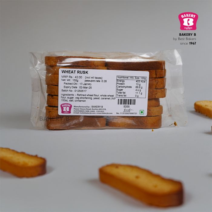 Indulge in the crunchy and aromatic goodness of our Wheat Rusk, a twice-baked delicacy made from refined wheat flour, ghee, and a blend of vanilla, cardamom, and cumin. Light yet satisfying, it offers a delightful balance of sweetness and crispness, making it the perfect companion to your tea or coffee. Enhanced with semolina and milk powder for a rich texture.